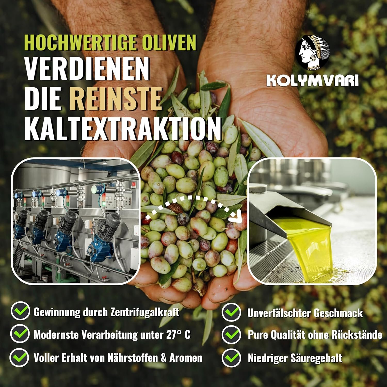 Handernte garantiert die beste Ausgangsqualit?t, Kaltextraktion bewahrt alle wertvollen Inhaltsstoffe ¨C perfektes Oliven?l!