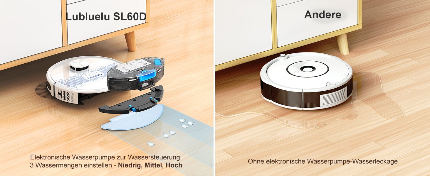 Lubluelu Saugroboter wird für seine intelligente elektronische Wasserpumpe und die dreistufige Wassermengenregulierung bewundert. Deshalb ist unser Staubsaugroboter ein fester Bestandteil Ihrer täglichen Bodenreinigung, er wird Ihnen helfen, sich von lästiger Hausarbeit zu befreien.